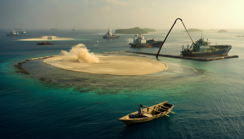 A Filipino fisherman steers his boat toward what his grandfather says used to be open water on a foggy morning